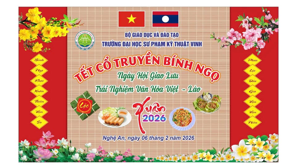 Nhằm chào đón Tết cổ truyền Xuân Bính Ngọ 2026 trong không khí ấm áp, gắn kết và giàu bản sắc, Trường Đại học Sư phạm Kỹ thuật Vinh phối hợp cùng Ban liên lạc quân tình nguyện và Chuyên gia quân sự giúp Lào tỉnh Nghệ An tổ chức Ngày hội giao lưu – Trải nghiệm văn hóa Việt – Lào dành cho Lưu học sinh Lào và Sinh viên Việt Nam.